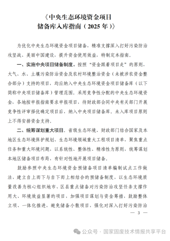 為深入貫徹黨中央、國務(wù)院有關(guān)決策部署,提高預(yù)算安排的科學(xué)性、規(guī)范性和前瞻性,進(jìn)一步充分發(fā)揮中央生態(tài)環(huán)境資金項目儲備庫作用,對持續(xù)深入打好污染防治攻堅戰(zhàn)和推進(jìn)美麗中國建設(shè)形成有力支撐,根據(jù)《生態(tài)環(huán)境領(lǐng)域中央和地方財政事權(quán)和支出責(zé)任劃分改革方案》《中央生態(tài)環(huán)保轉(zhuǎn)移支付資金項目儲備制度管理暫行辦法》《中央生態(tài)環(huán)境資金項目管理規(guī)程》以及生態(tài)環(huán)境資金管理辦法等有關(guān)文件,生態(tài)環(huán)境部、財政部修訂了《中央生態(tài)環(huán)境資金項目儲備庫入庫指南(2025年)》。(來源:農(nóng)村污水)